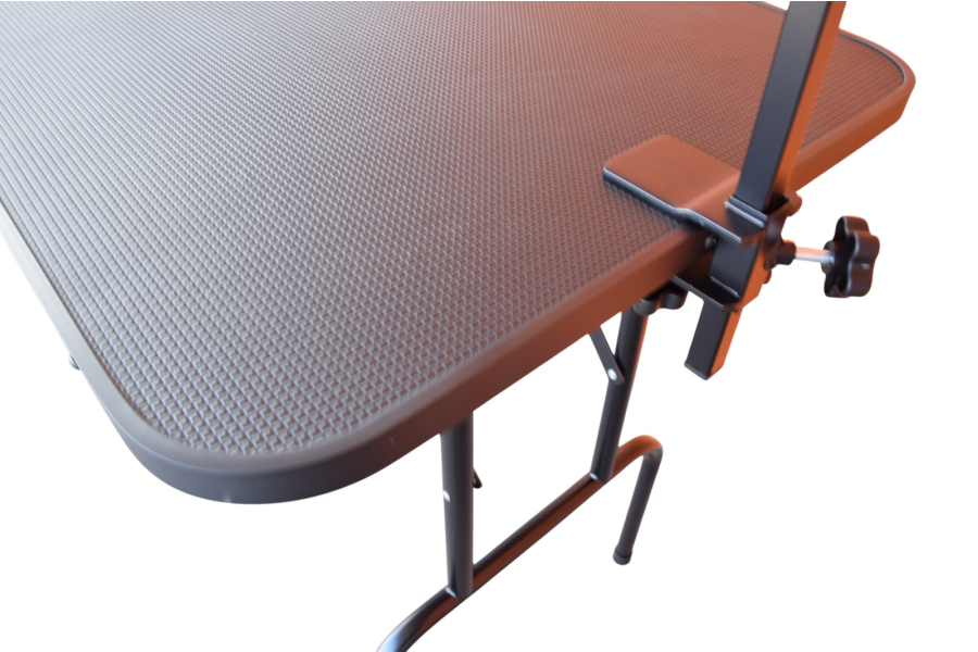 Trim.nl trimtafel voor hond en kat, opvouwbaar 110x61x80cm hoog (dus net iets hoger dan stndarad 77cm) met blad voorzien van zwart rubberen toplaag en kunststof rand. Nette opvouwbare trimtafel met zwart gelakte poten voorzien van scharniersysteem waardoor u de tafelpoten simpelweg uitklapt en de tafel direct neer kunt zetten. U hoeft de poten dus niet apart te borgen door de stabilatorstangen in de gaten in de poten te knijpen (hetgeen vaak zwaar en lastig gaat).