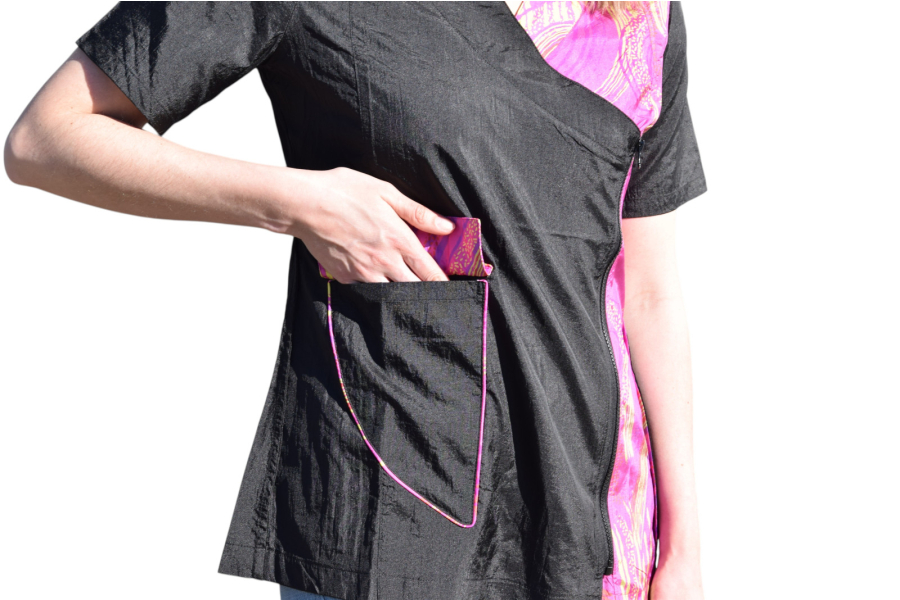 Mooi trimshirt met zijsluiting en drukker bovenin. Trimshirt, met V hals en 1 zak met klepje zodat haren er niet in kunnen vallen tijdens het knippen.