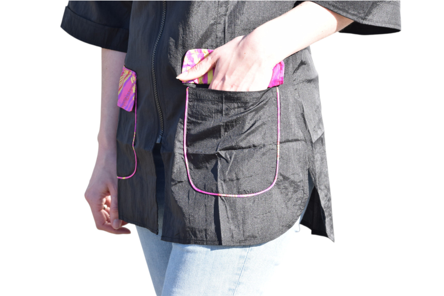 Split aan de zijkant om vrij te kunnen gaan zitten en 3/4 mouwen zodat het haar niet in de binnenkant elleboog blijft hangen. Mooi getailleerd trimshirt, met opstaand kraagje en 2 zakken met klepjes zodat haren er niet in kunnen vallen tijdens het knippen.