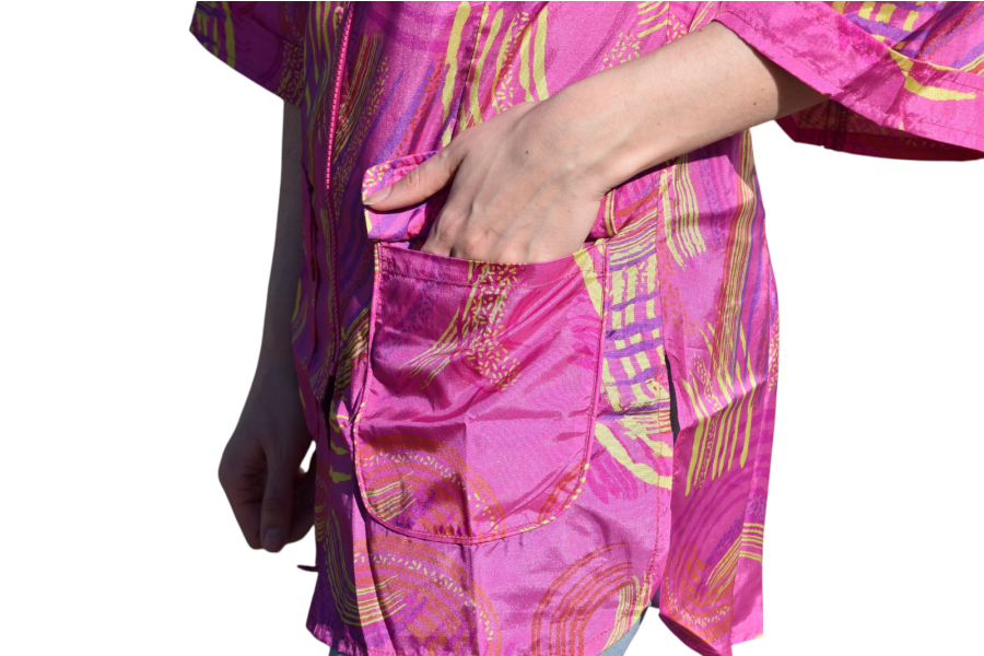 Split aan de zijkant om vrij te kunnen gaan zitten en 3/4 mouwen zodat het haar niet in de binnenkant elleboog blijft hangen. Mooi getailleerd trimshirt, met opstaand kraagje en 2 zakken met klepjes zodat haren er niet in kunnen vallen tijdens het knippen.